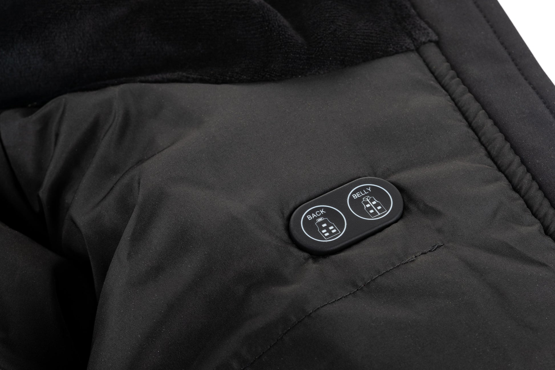 La veste dispose de 9 grandes zones de chauffe : 4 à l’avant et 5 à l’arrière. La batterie LiPo se branche facilement dans une poche intérieure. Le bouton Dual Heating permet d’activer 5 zones ou la totalité des 9. Trois niveaux de chaleur sont disponibles, avec une température maximale de 68°C.